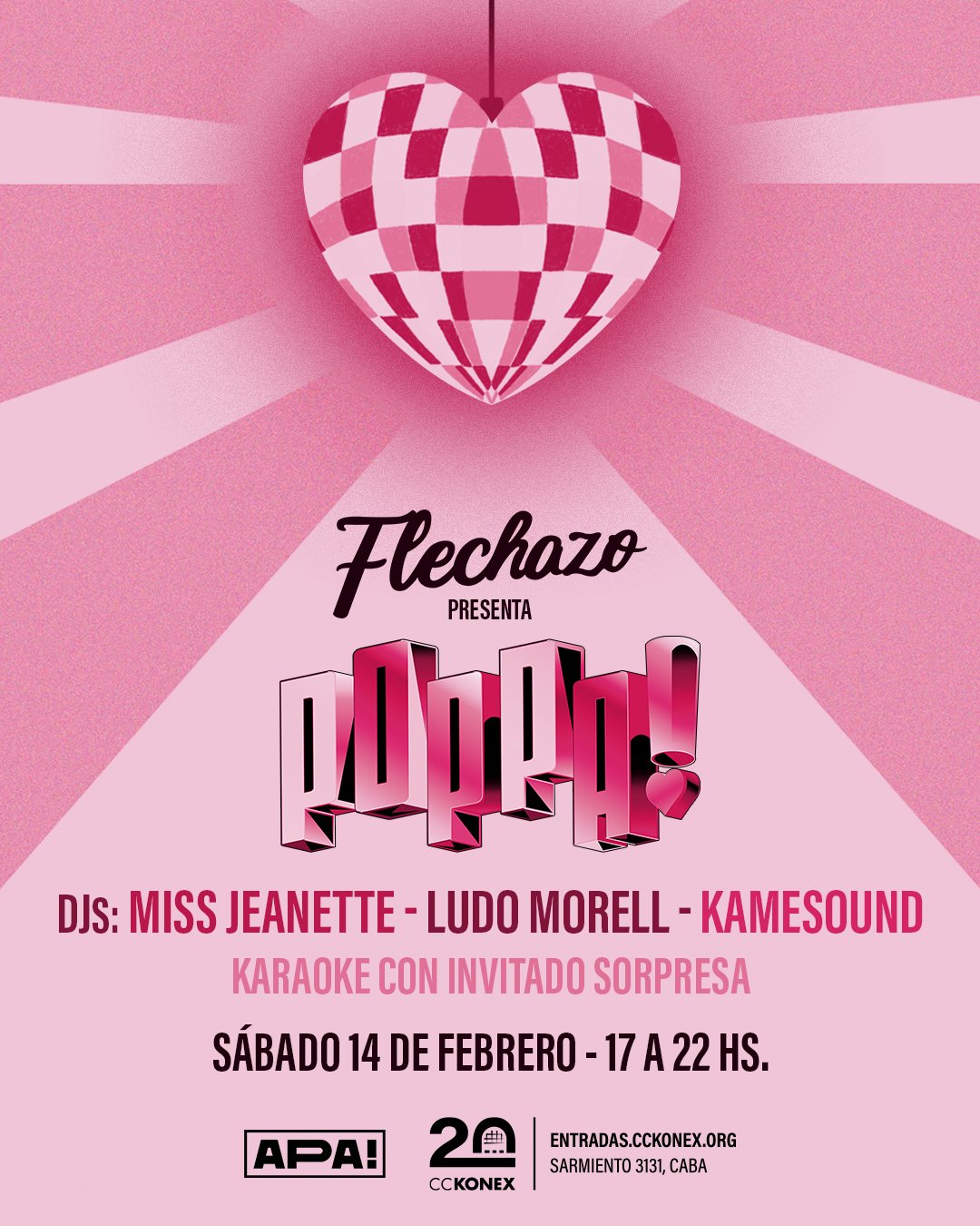 la música pop, el baile, la amistad y el amor en todas sus formas. Vení a recibir el flechazo del pop con tu pareja, tus amigos, o solo, ¿por qué no? Por primera vez, Fiesta Poppa! llega al Ciudad Cultural Konex en su clásico festival de verano 2026 para vivir una tarde donde todos son bienvenidos.