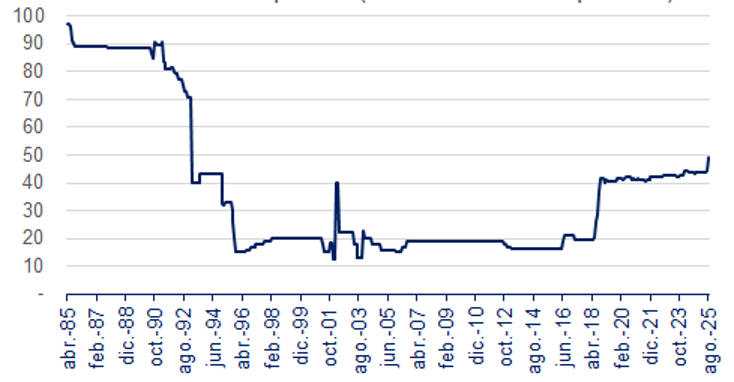 Exigencia de encajes (bruta, total exigible) sobre cuentas corrientes en pesos (como % de esos depósitos) |