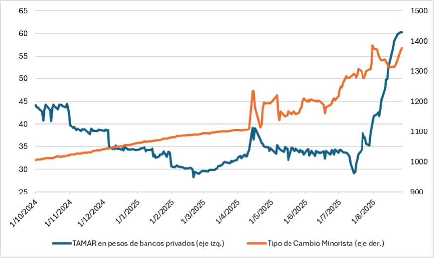 Tras la suba cambiaria de julio (en particular, el dólar subió de $1.305,05 a $1.385,56 entre el 29 y 31 de dicho mes, un 6,2%), la intervención del gobierno fue a través de mayor control de los agregados monetarios, buscando descongestionar la disponibilidad de pesos sobre la demanda de dólares. Esto requiere un elevado nivel de roll-over, para evitar que salgan a circulación pesos que hoy están congelados en títulos públicos. Esto generó elevados incrementos de la tasa de interés (sobre la cual, como insiste el ministro de Economía Luis Caputo, no pueden intervenir porque es endógena), que actualmente se encuentra en 60,25% i.a. y 79,88% e.a. (la TAMAR que publica el BCRA): casi tres veces más que la inflación esperada según el REM (21,2% i.a.).