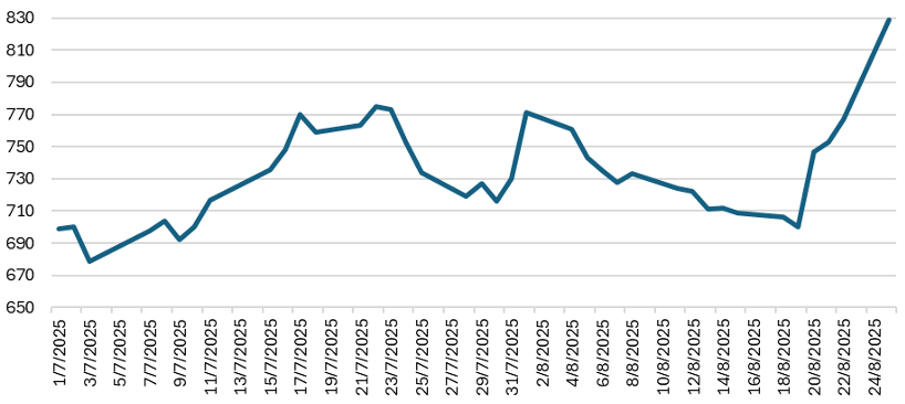 El riesgo país se ubica hoy en 829 puntos: sufrió una suba diaria de 8%. Respecto del 1 de julio de este año se incrementó 18,6% y se ubica en los mismos niveles que tenía hace cuatro meses. Desde los niveles mínimos alcanzados en enero de este año, el incremento es cercano al 50%. | Evolución diaria del riesgo país | Fuente: en base a Ámbito Financiero. |
