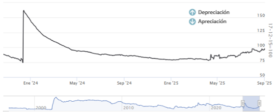 Aún así, no sirvió para contener la demanda de dólares, que era el efecto buscado por el Gobierno. Como era esperable, la estrategia del gobierno de sostener la apreciación cambiaria no sólo era errada a priori sino que también resultó insuficiente: de punta a punta, entre el 31 de julio de este año y el 2 de septiembre, el dólar bajó apenas 0,5% (de $1.385,56 a $1.378,91). Pero eso fue producto de que bajó a $ 1.311 el 14 de agosto y desde entonces recuperó todo lo apreciado en la quincena previa. El techo de la banda en septiembre es de alrededor de $1480,5.