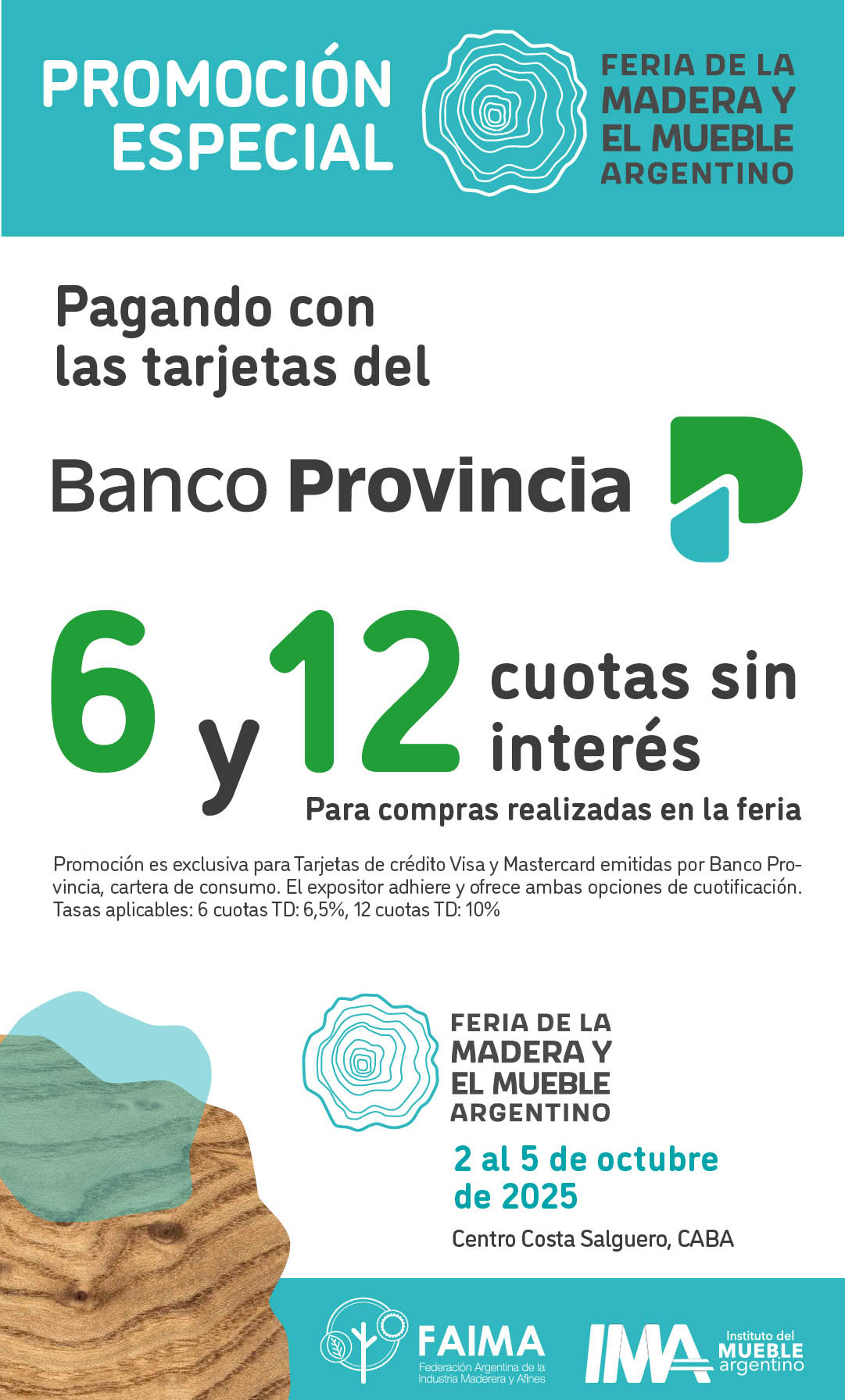 PROMO EXCLUSIVA DEL BANCO PROVINCIA PARA LA FERIA DE LA MADERA Y EL MUEBLE ARGENTINO | Vení a la Feria de la Madera y el Mueble Argentino y aprovechá esta super promoción. Hay 6 y 12 cuotas para las compras realizadas en la Feria con tarjetas del Banco Provincia. Si pensabas renovar muebles y sos cliente del banco, es un excelente oportunidad. La Feria de la Madera y el Mueble Argentino tendrá lugar del 2 al 5 de octubre próximos en el Centro Costa Salguero de la Ciudad Autónoma de Buenos Aires, organizada por la Federación Argentina de la Industria Maderera y Afines (FAIMA) y el Instituto del Mueble Argentino (IMA). Busca visibilizar y comercializar muebles y bienes finales